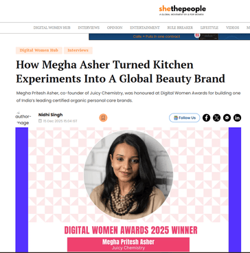 At the Digital Women Awards 2025, Megha Pritesh Asher, co-founder of Juicy Chemistry, was recognised in the E-commerce category for building one of India’s leading certified organic personal care brands. Juicy Chemistry creates certified organic skincare that is powered by nature and proven by science, with a strong focus on transparency and purity.